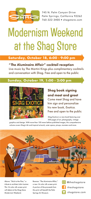 Check out all the events happening at The Shag Store for October Modernism Weekend 2025 in Palm Springs starting October 16th and ending on the 19th! There will be two limited-edition fine art print debuts. A special release party for "The Aluminaire Affair" fine art print with Shag in attendance signing purchased items, live music from The Martini Kings, and complimentary cocktails. A book signing with Shag celebrating the new Shag Exotica hardcover book! Click for all the details!