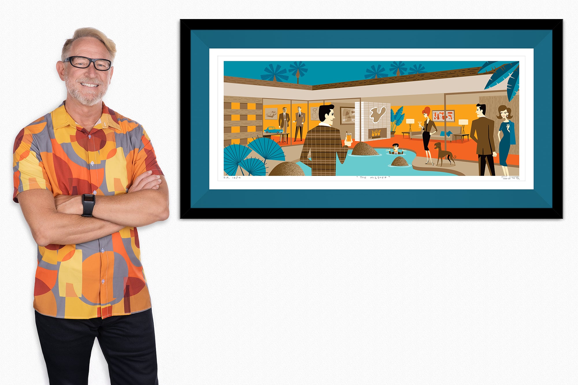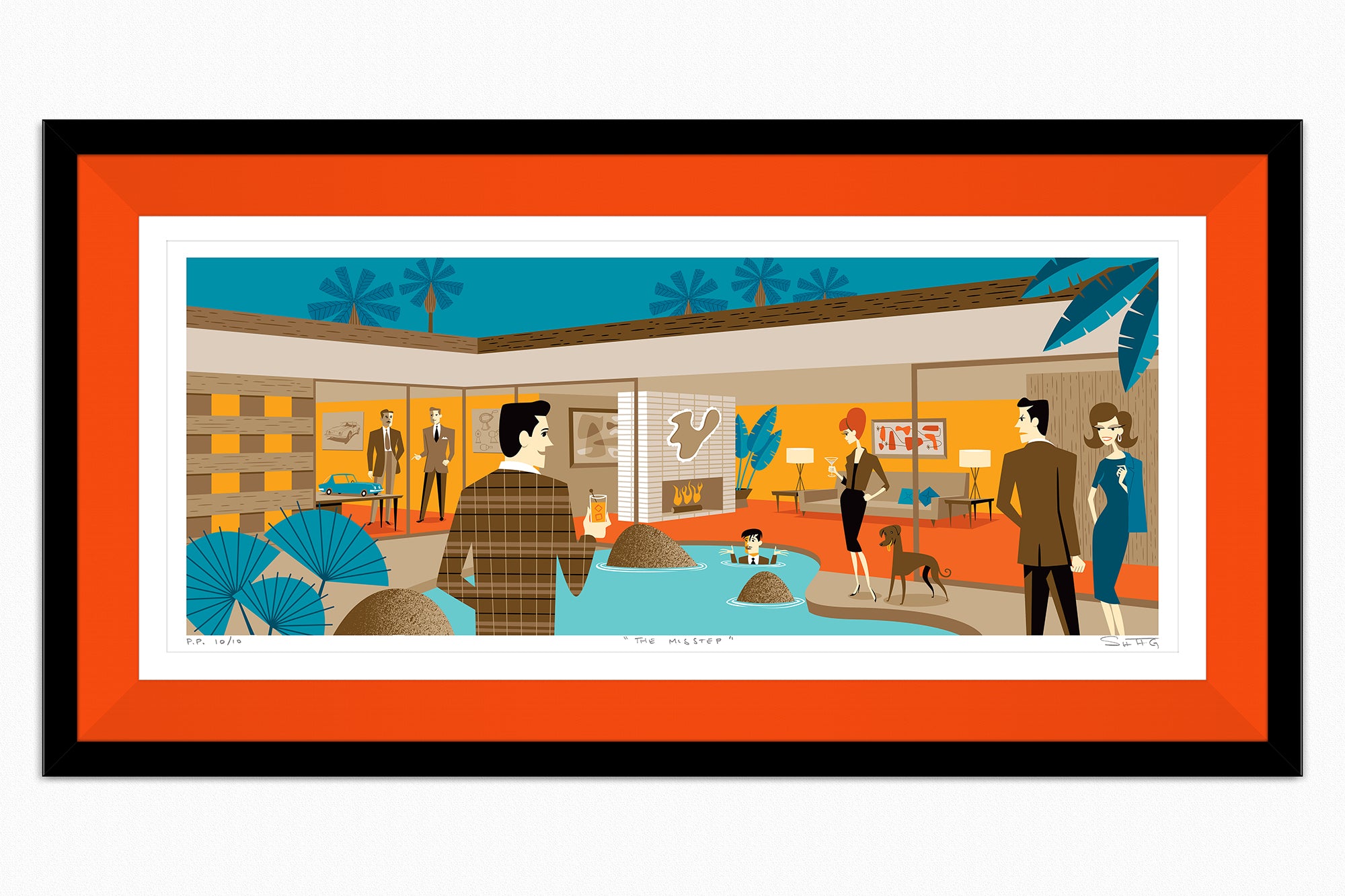 Shag's fine art print, The Misstep, depicts a story that happened at the famous Raymond Loewy House designed by architect Albert Frey in Palm Springs, California. The story goes that a famous actor fell into the indoor/outdoor pool at the house and Raymond Loewy, designer of the Studebaker Avanti, jumped into the pool to save the actor from embarrassment.